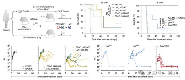 作者的AAV/EDV雙載體in vivo CAR-T療效優(yōu)于傳統(tǒng)的ex vivo CAR-T(LVV指示隨機(jī)整合,TRAC指示定點(diǎn)整合)
