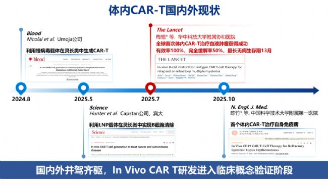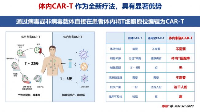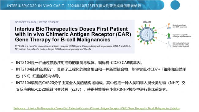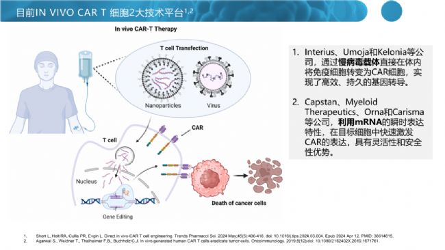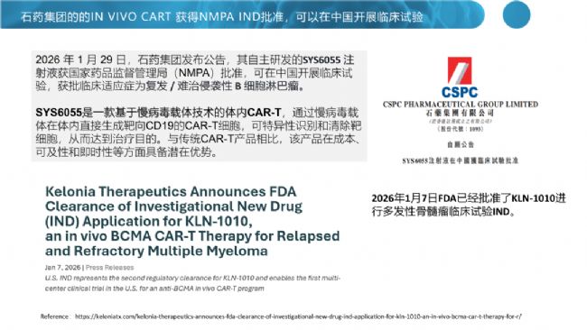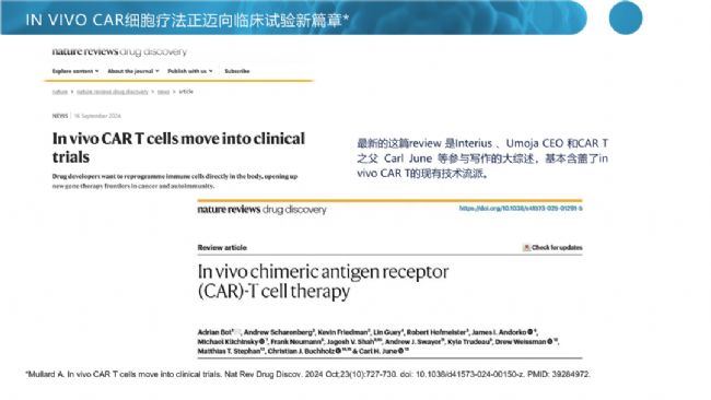 首先推薦大家去看Nature Drug Discovery 發(fā)表的review,是Interius CEO 、Umoja CEO 和CAR T之父 Carl June 等參與寫作的大綜述,基本涵蓋了in vivo CAR T的現(xiàn)有技術(shù)流派和臨床前數(shù)據(jù)。其次石藥集團(tuán)的慢病毒載體in vivo CAR T(SYS6055)率先在中國獲批IND,給業(yè)界一個驚喜,這款CD 19 in vivo CAR T計劃適應(yīng)癥是復(fù)發(fā)難治侵襲性B細(xì)胞淋巴瘤,將在北京大學(xué)腫瘤醫(yī)院開展臨床試驗。