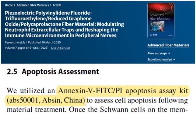 外周神經(jīng)損傷后,免疫穩(wěn)態(tài)失衡是阻礙神經(jīng)修復(fù)的關(guān)鍵瓶頸。近年來,壓電材料因能為受損神經(jīng)補(bǔ)充電信號、改善能量微環(huán)境,成為神經(jīng)再生領(lǐng)域的研究熱點(diǎn),但這類材料如何調(diào)控免疫穩(wěn)態(tài)、促進(jìn)神經(jīng)修復(fù)的機(jī)制仍未明確。近期,《Advanced Fiber Materials》(2025, 7:645–663)發(fā)表的研究,成功構(gòu)建了 P (VDF-TrFE)/rGO/PCL 壓電復(fù)合神經(jīng)支架,通過調(diào)控中性粒細(xì)胞胞外陷阱(NETs)重塑免疫微環(huán)境,實(shí)現(xiàn)了優(yōu)異的外周神經(jīng)修復(fù)效果,而 Absin 的凋亡檢測試劑盒在其中發(fā)揮了關(guān)鍵技術(shù)支撐作用。
