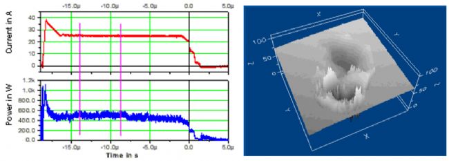 用CLSM對(duì)跳躍等離子通道基座的隕石坑進(jìn)行分析。對(duì)隕石坑結(jié)構(gòu)和電壓、電流曲線的記錄為等離子體基座的移動(dòng)提供了機(jī)會(huì)。在圖3中,我們看到了兩個(gè)隕石坑,這是兩個(gè)串聯(lián)放電(功率圖)和第二個(gè)等離子體通道的基座跳躍的結(jié)果。電壓崩潰非常小,因此氣體泡的形成不足,與不間斷的氣體泡不同。