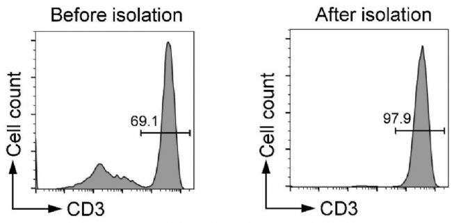 從人PBMC中分選CD3+ T細(xì)胞,用PE標(biāo)記的 anti-human CD3抗體(克隆號(hào)OKT3)染色后進(jìn)行流式細(xì)胞分析. 結(jié)論:分選前后的CD3+ T細(xì)胞純度分別為69.1%和97.9%。