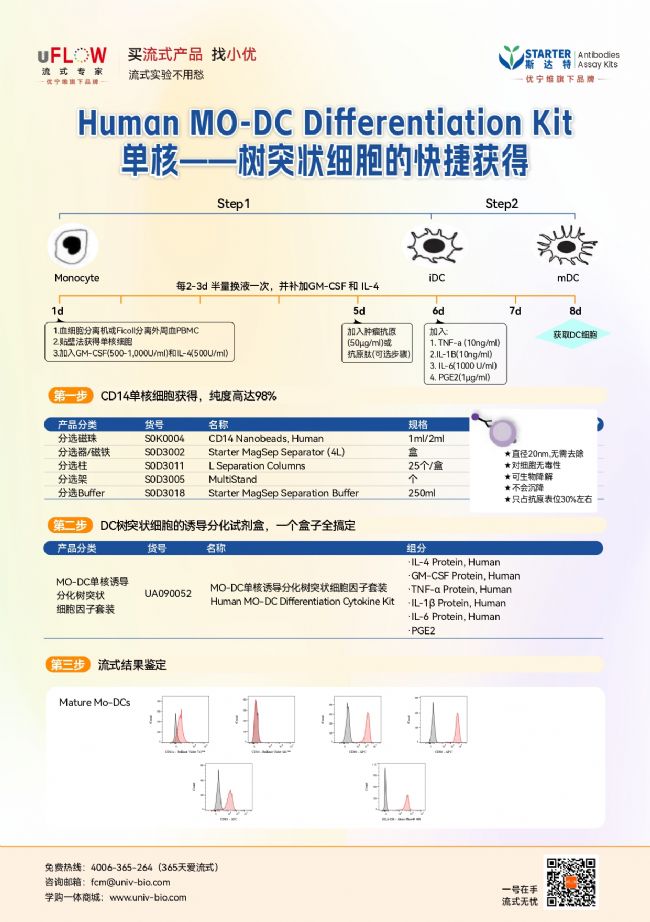 別擔(dān)心!優(yōu)寧維「UFlow 流式專家」聯(lián)合斯達特品牌,推出Human MO-DC Differentiation Kit(單核 - 樹突狀細胞誘導(dǎo)分化全流程解決方案),并開啟專屬推廣活動!從單核細胞分離、誘導(dǎo)分化到流式鑒定,全流程試劑、設(shè)備一站式配齊,僅需 8 天就能高效獲得高純度成熟 DC,新手也能輕松上手!