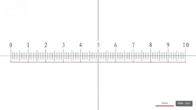 3、在顯微鏡平臺上放置一個適當?shù)臏y量基準,如平臺測微計或帶有精確長度刻度的直尺,并在特定放大倍率值下使其清晰聚焦(參見圖 2)。