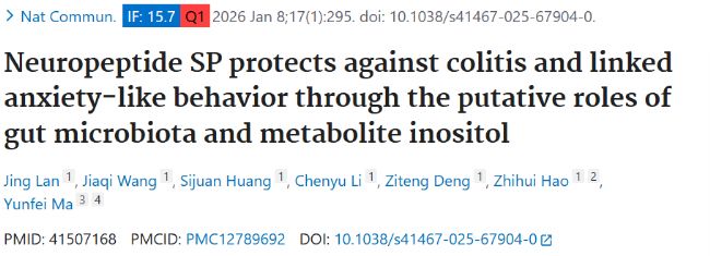 參考文獻(xiàn):Lan J, Wang J, Huang S, Li C, Deng Z, Hao Z, Ma Y. Neuropeptide SP protects against colitis and linked anxiety-like behavior through the putative roles of gut microbiota and metabolite inositol. Nat Commun. 2026 Jan 8;17(1):295. doi: 10.1038/s41467-025-67904-0IF: 15.7 Q1 . PMID: 41507168; PMCID: PMC12789692.