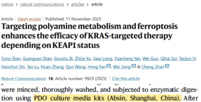 在腫瘤治療領(lǐng)域,KRAS 突變癌癥因耐藥性問(wèn)題一直是臨床難題,而 KEAP1 共突變更是讓治療效果雪上加霜。近期《Nature Communications》發(fā)表的重磅研究,揭示了基于 KEAP1 狀態(tài)的精準(zhǔn)治療新策略 —— 靶向 SAT1 介導(dǎo)的多胺代謝與鐵死亡,可顯著增強(qiáng) KRAS 靶向治療療效。Absin 類(lèi)器官培養(yǎng)試劑盒在研究中發(fā)揮關(guān)鍵作用,助力科研團(tuán)隊(duì)完成核心實(shí)驗(yàn)驗(yàn)證。