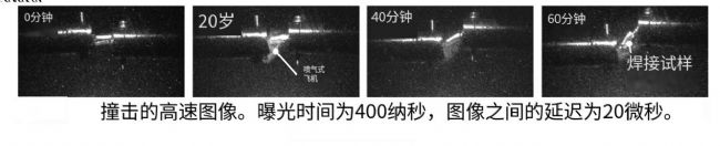 用高速攝影機(jī)拍攝碰撞,以研究碰撞點(diǎn),即結(jié)合區(qū)的形成。由于這一過程的速度非常快,實際焊接只需要幾微秒,因此我們使用了PCO的超高速特殊圖像增強(qiáng)器型號相機(jī)(由廣州市元奧儀器有限公司提供的pco.dicam 型號相機(jī))。它允許一個非常高的幀速率在仍然相當(dāng)大的空間分辨率。這種系統(tǒng)的缺點(diǎn)是它最多只能使用8幀,因此不允許預(yù)觸發(fā)。因此,來自測試平臺的觸發(fā)信號必須盡可能精確和可重復(fù),以獲得可比圖像。