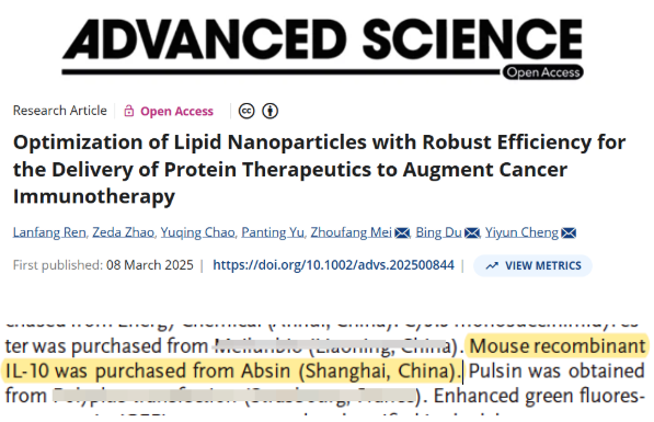 在生物制藥領(lǐng)域,蛋白類治療藥物憑借高活性、高特異性的優(yōu)勢(shì),成為癌癥、自身免疫性疾病等重大疾病治療的核心方向。然而,蛋白藥物的胞內(nèi)遞送始終面臨著封裝效率低、內(nèi)體逃逸難、血清穩(wěn)定性差等多重挑戰(zhàn),嚴(yán)重限制了其臨床應(yīng)用潛力。近日,一項(xiàng)發(fā)表于《Advanced Science》的重磅研究(DOI: 10.1002/advs.202500844)成功破解了這一難題 —— 研究團(tuán)隊(duì)設(shè)計(jì)了一種新型五組分脂質(zhì)納米顆粒(LNPs),實(shí)現(xiàn)了多種蛋白藥物的高效胞內(nèi)遞送,為癌癥免疫治療帶來(lái)了革命性突破。該研究中,Absin的重組小鼠IL-10蛋白作為關(guān)鍵的實(shí)驗(yàn)材料,為驗(yàn)證LNPs的遞送效能提供了重要依據(jù)。