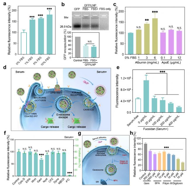 LNPs 的血清耐受機(jī)制與細(xì)胞內(nèi)轉(zhuǎn)運(yùn)路徑(原文 Figure 3)