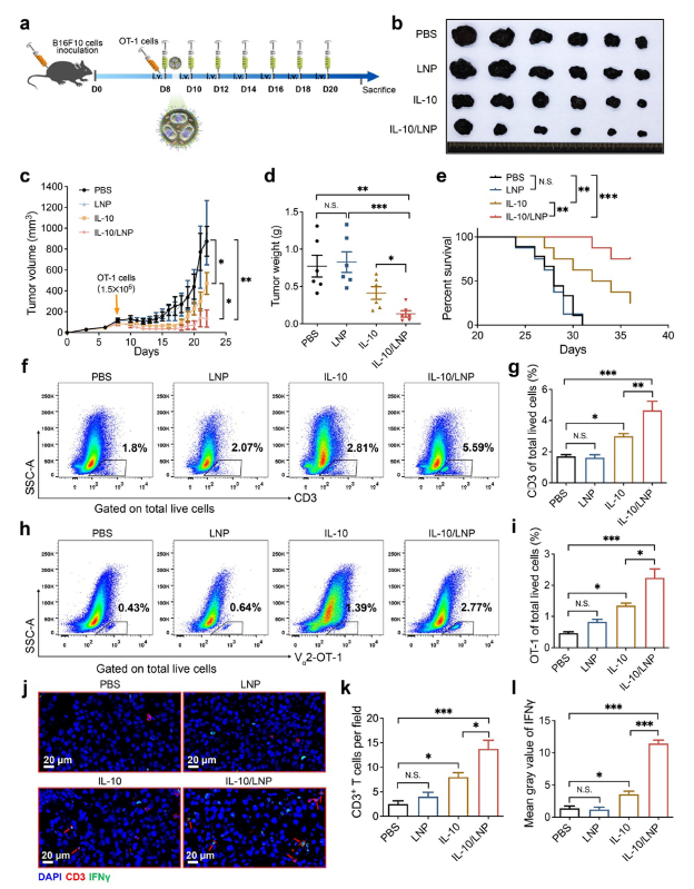 - 體內(nèi)實(shí)驗(yàn):構(gòu)建 IL-10-LNPs 制劑,通過(guò)靜脈注射遞送,評(píng)估其在黑色素瘤模型中增強(qiáng)過(guò)繼性 T 細(xì)胞治療的效果。