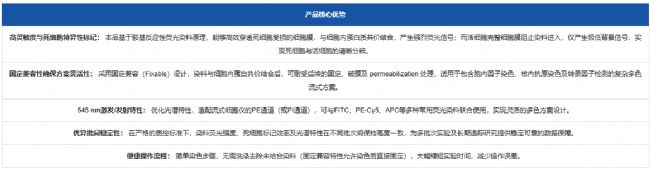 杭州斯達特生物科技有限公司自主研發(fā)的死活細胞染料(Fixable Viability Dye 545)(貨號:S0D0014),是一款具有高靈敏度、優(yōu)異固定兼容性及便捷操作特性的細胞活力分析染料產(chǎn)品。該染料采用胺基反應(yīng)性熒光標記技術(shù),能夠特異性標記死細胞,在流式細胞術(shù)免疫表型分析、多色方案設(shè)計、細胞功能研究及單細胞測序樣本質(zhì)控等領(lǐng)域具有重要應(yīng)用價值。