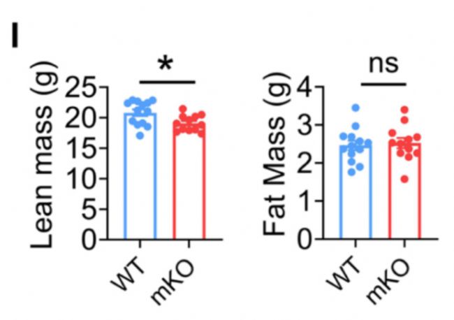 原文圖 1I: MCT1 敲除小鼠瘦體重顯著降低,脂肪量無顯著變化,精準反映體成分重塑表型