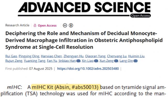 產(chǎn)科抗磷脂綜合征(OAPS)作為一種自身免疫性疾病,常導(dǎo)致復(fù)發(fā)性流產(chǎn)、死胎等不良妊娠結(jié)局,嚴(yán)重威脅母嬰健康。近日,《Advanced Science》發(fā)表重磅研究,通過單細(xì)胞測(cè)序技術(shù)深度解析 OAPS 患者蛻膜與外周血免疫微環(huán)境的關(guān)聯(lián),揭示了單核細(xì)胞衍生巨噬細(xì)胞(MDMs)浸潤的核心作用機(jī)制。Absin 多重?zé)晒饷庖呓M化試劑盒(abs50013)全程助力該研究的關(guān)鍵實(shí)驗(yàn),為機(jī)制驗(yàn)證提供了可靠技術(shù)支撐。