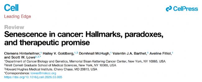 近期,紀念斯隆凱特琳癌癥中心團隊在國際頂刊《Cell》上發(fā)表了一篇題為“Senescence in cancer: Hallmarks, paradoxes, and therapeutic promise”的綜述性論文。