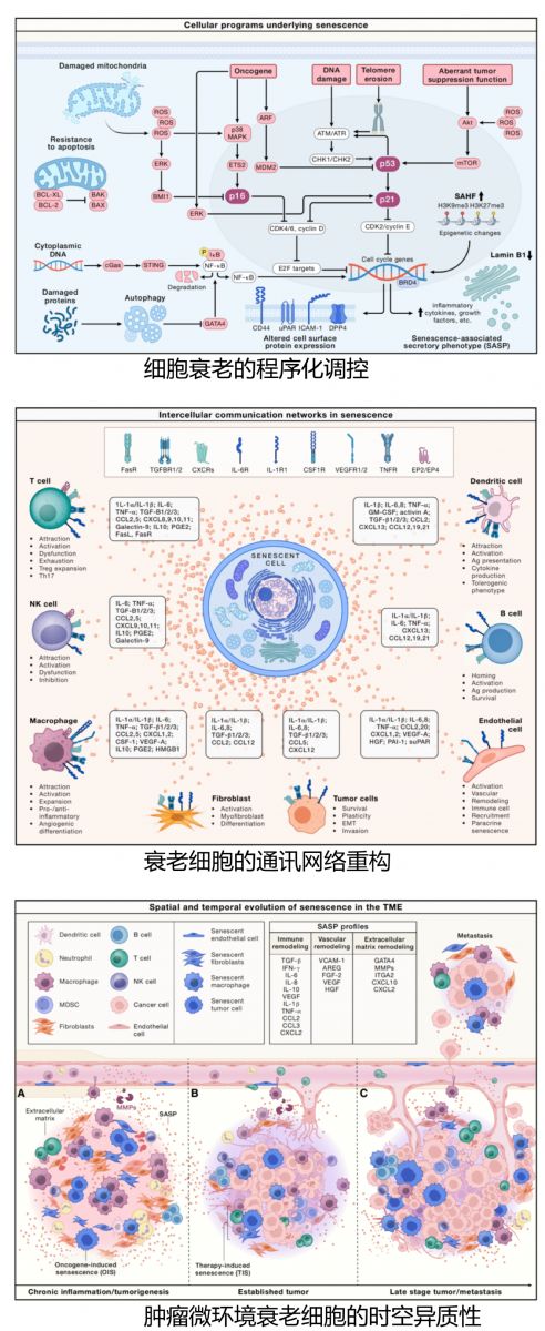 該綜述系統(tǒng)歸納了細胞衰老的六大核心特征,并深入剖析了這些特征在不同生物學背景下如何被差異化激活、呈現(xiàn)多樣化表現(xiàn)形式以及重塑其生物學功能。特別聚焦于癌癥領域,詳細探討了細胞衰老如何通過細胞內(nèi)在調(diào)控機制和腫瘤微環(huán)境調(diào)節(jié)機制,對腫瘤的發(fā)生、演變過程以及治療反應產(chǎn)生重要影響。此外,該綜述還對治療性調(diào)控細胞衰老的新興策略進行了全面評估,著重強調(diào)了精準干預所帶來的機遇以及當前尚未攻克的技術(shù)挑戰(zhàn)。