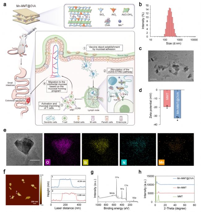 研究團(tuán)隊創(chuàng)新性地選擇蒙脫土(MMT)作為載體,通過離子交換技術(shù)將錳離子(Mn²⁺)和腫瘤抗原(OVA)嵌入其層狀結(jié)構(gòu)中,構(gòu)建 Mn-MMT@OVA 口服疫苗。其核心設(shè)計邏輯如下: