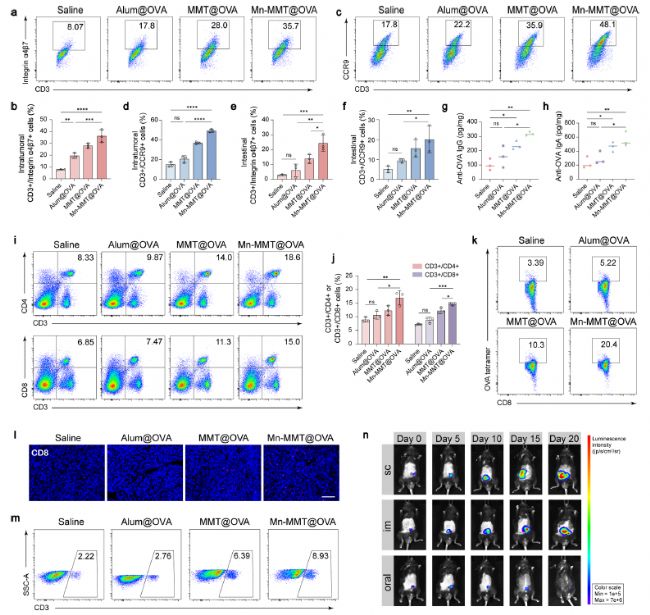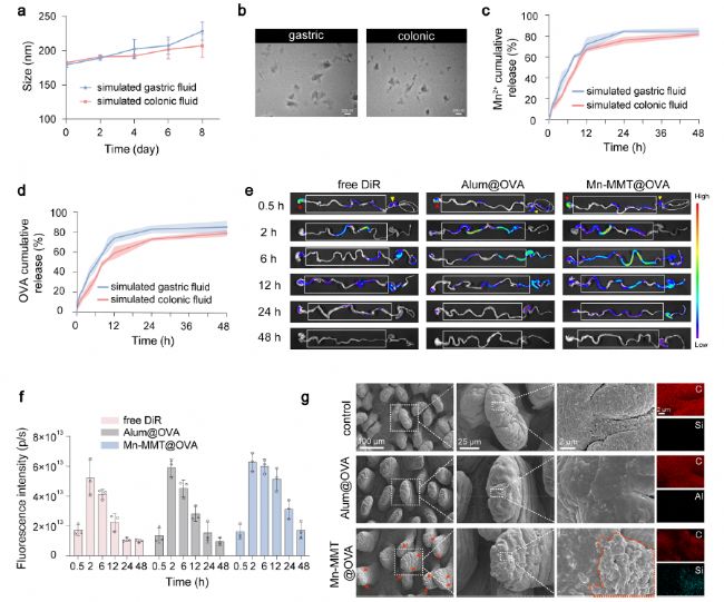 更重要的是,Mn-MMT@OVA 通過與腸道黏液蛋白(MUC2)的氫鍵、范德華力和靜電作用,實現(xiàn)腸道黏膜高效黏附,形成 “疫苗儲庫”,顯著延長腸道滯留時間(比傳統(tǒng)鋁佐劑疫苗長 2 倍以上)(對應(yīng)原文圖 2e-g、圖 3)。