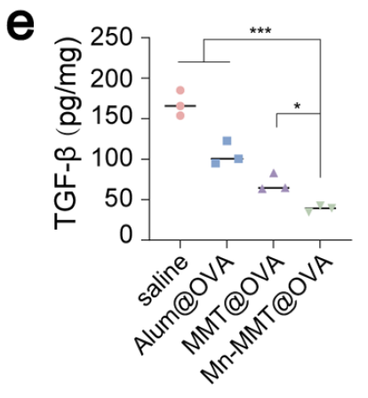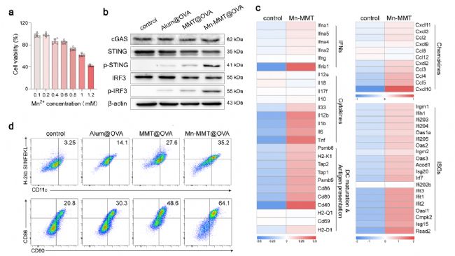 Mn-MMT@OVA 釋放的 Mn²⁺能強(qiáng)效激活 DCs 中的 cGAS-STING 通路,使磷酸化 STING(p-STING)和磷酸化 IRF3(p-IRF3)表達(dá)顯著升高,進(jìn)而促進(jìn) DCs 成熟(CD11c⁺/CD80⁺/CD86⁺細(xì)胞比例達(dá) 64.1%)和抗原呈遞(CD11c⁺/H-2Kb SIINFEKL⁺細(xì)胞比例達(dá) 86.0%),遠(yuǎn)優(yōu)于傳統(tǒng)鋁佐劑疫苗(對應(yīng)原文圖 4a-d)。