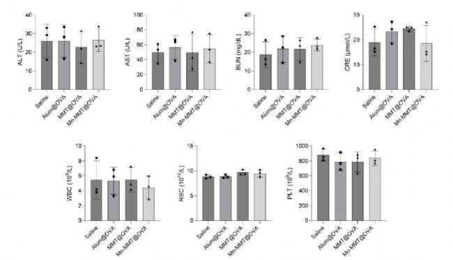 實驗期間小鼠體重穩(wěn)定,心、肝、脾、肺、腎等重要器官無形態(tài)異常,血常規(guī)和肝腎功能指標(biāo)均在正常范圍,證實疫苗安全性良好(對應(yīng)原文圖 6f、圖 S16-S17)。