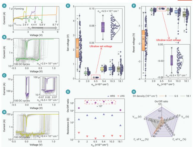 (E和F)不同SV密度下set/reset電壓的統計分析。插圖顯示了nsv=6.5×1013cm-2時的set/reset電壓分布。