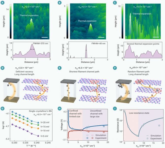 (A-C) nsv從2.0×1013cm-2到9.4×1013cm-2的h-BN憶阻器的SJEM圖像(有效器件面積為3×3um,比例尺代表500nm)及其對應的高度輪廓曲線。