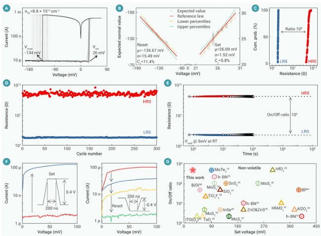 圖3.非易失性h-BN基憶阻器(nsv=8.8×1013cm-2)中的超低工作電壓。