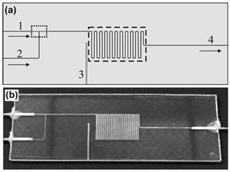 1:分散相和連續(xù)相的入口;2:分散相和連續(xù)相的入口;3:用于插入熱電偶的通道;4:一個(gè)出口;左虛線框標(biāo)記:用于產(chǎn)生液滴的T接點(diǎn);右虛線框標(biāo)記:存儲(chǔ)區(qū)域。