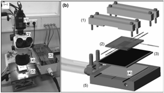該裝置包括一個(gè)CCD相機(jī)(PCO德國(guó)pco.edge5.5)和一個(gè)體視顯微鏡,具有兩個(gè)注射泵的盒子,該兩個(gè)注射泵由加熱風(fēng)扇和用于微流體裝置的溫度控制單元進(jìn)行恒溫,如圖所示。使用冷卻微流體設(shè)備以誘導(dǎo)結(jié)晶,可以快速建立超飽和。將鋁板置于元件和微氟化物裝置之間,該鋁板覆蓋有導(dǎo)熱箔,以避免溫度梯度小。由于需要去除元件的排氣熱量,所以將元件中放置在帶有熱源的鋁塊上。在結(jié)晶實(shí)驗(yàn)過(guò)程中,該塊保持在一個(gè)通過(guò)使用恒溫器保持溫度。