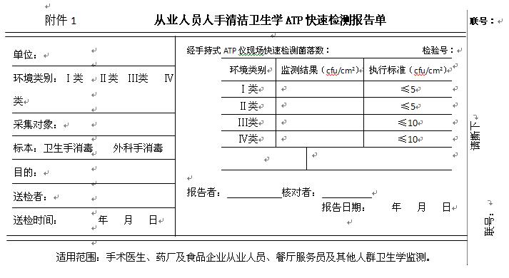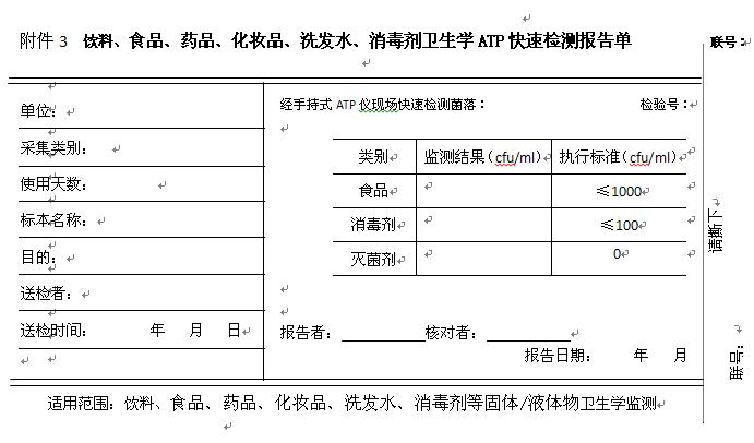 根據(jù)相關(guān)規(guī)范和用戶需求,列出了手持式ATP儀檢測(cè)報(bào)告單格式(附件1至附件3)僅供參考,使用過程中可根據(jù)情況進(jìn)行修改。