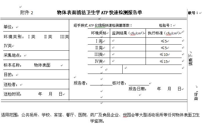 可按照<<醫(yī)院消毒衛(wèi)生標(biāo)準(zhǔn) 附錄A(規(guī)范性附錄)采樣及檢查方法>>等規(guī)范要求再參照手持式ATP儀說明書采樣、檢測(cè)、計(jì)算得出結(jié)果并以下表形式予以報(bào)告。