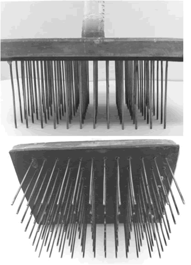 (7) 將復(fù)制器半成品的針端平鋪在平整桌面上的砂布(砂紙)上來回移動打磨,直至將所有針端磨到同一個平面。