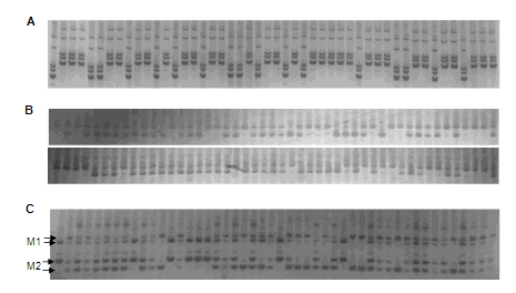 A: 用SSR標(biāo)記對水稻種質(zhì)材料進(jìn)行基因型檢測。B, C: 用Indel標(biāo)記對水稻分離群體進(jìn)行基因型檢測。2個InDel標(biāo)記(M1, M2)在同一PCR反應(yīng)進(jìn)行基因型檢測(C)。所有PCR反應(yīng)是用96針復(fù)制器加入gDNA約0.5 µL,PCR條件為95℃ 2 min, 35循環(huán)的94℃ 30 s, 56℃ 30 s,72℃ 30 s. A: Genotyping of rice germplasms with a SSR marker. B, C: Genotyping of rice segregation populations with InDel markers. Two markers (M1, M2) were analyzed in the same PCRs (C).