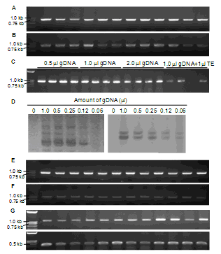 A, B: PCR using 1.0 µL rice gDNA prepared from 2–3 mg and 10 mg of seedling leaf tissue in 150 µL preparation buffer, respectively. C: Using different volumes of rice gDNA prepared from 3 mg seedling leaf tissue in 150 µL preparation buffer as PCR template. D: Use of decreased amounts of gDNA (from 2–3 mg seedling leaf in 150 µL preparation buffer) for performing PCR with InDel markers. E, F: PCR using 1.0 µL rice gDNA prepared from 2–3 mg and 10 mg of dried leaf tissue in 150 µL preparation buffer, respectively. G: PCR using 1.0 µL Arabidopsis thaliana gDNA prepared from 2–3 mg fresh leaf tissue in 150 µL preparation buffer. A–C, E–G were conducted in 20 µL PCRs containing 0.8 U Taq, with thermal conditions of 95℃ 2 min, 33 cycles of 94℃ 30 s, 56℃ 30 s, 72℃ 1.5 min. PCR setting and thermal conditions in D were the same as those in Fig. 3.