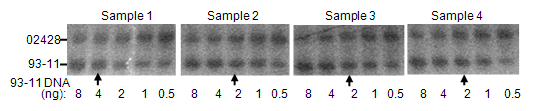 Different amounts (0.5–8 ng) of standard genomic DNA from a rice variety (93-11) were mixed with 1 µL genomic DNA from another variety (02428), and used as the template for PCR with primers (Table 1) of an InDel marker. Arrows show the band intensities in the reactions (or between two reactions) of 02428 and 93-11 were similar, indicating that the amounts of 02428 gDNA were about the same as those of indicated standards.