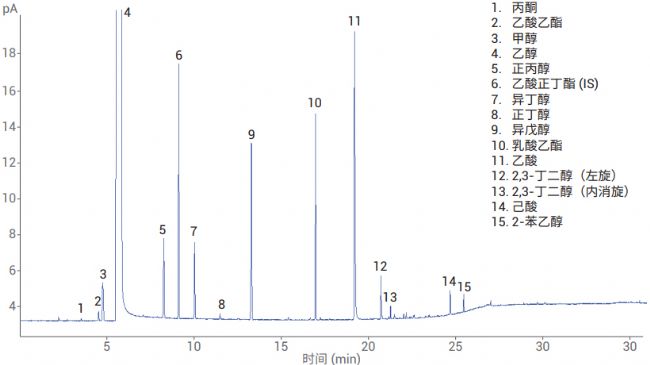 中國白酒以其濃郁的風味以及悠長的回味而聞名于世。根據(jù)香型,中國白酒可以分為醬香型,濃香型,清香型,米香型等。長期以來,人們對白酒的研究主要集中在微生物的進化和發(fā)酵過程中風味物質(zhì)的形成等方面,并且分析了主要芳香化合物(如酯、酸、醇和醛類物質(zhì))對典型白酒類型的影響。乙酸乙酯、乳酸乙酯和己酸乙酯的濃度和比例對白酒的風味起決定性作用。為保障飲酒者的健康,白酒生產(chǎn)過程中應(yīng)嚴格控制甲醇、異丁醇和異戊醇的濃度。在本應(yīng)用簡報中,將一些實際樣品進樣至