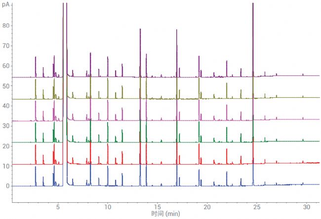 圖 8. 同一中國白酒樣品 6 次重復(fù)進樣的 GC/FID 疊加色譜圖