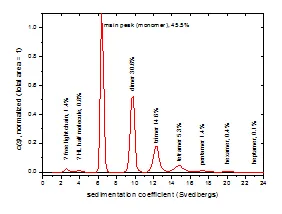 掃描得到沉降數(shù)據(jù)后,通過后續(xù)軟件分析可得到樣品表征結(jié)果,目前普遍應(yīng)用SEDFIT/SEDPHAT分析軟件。下圖為沉降速率數(shù)據(jù)分析擬合后得到的c(S)分布圖,根據(jù)分析結(jié)果可精準(zhǔn)檢測(cè)生物大分子聚集狀態(tài)以及聚集體準(zhǔn)確百分比含量。