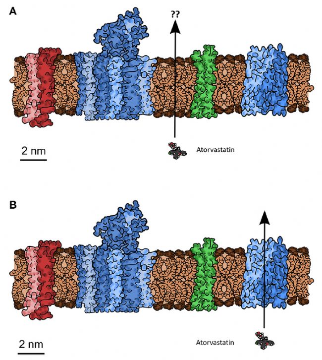 圖示大致按比例繪制的典型生物膜結(jié)構(gòu),表明典型的蛋白質(zhì):脂質(zhì)質(zhì)量比,以及小分子藥物(阿托伐他汀,也按比例繪制)可能通過的方式,包括(A)雙層脂質(zhì)擴散,通過名義上不受蛋白質(zhì)存在影響的雙層區(qū)域,或者(B)通過轉(zhuǎn)運體來實現(xiàn)中間代謝。(圖來源:Front Pharmacol. 2014 Oct 31;5:231.)