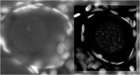 圖2:共焦(右側(cè)區(qū)域)和非共焦成像的比較。在Feulgen染色的小鼠滋養(yǎng)層中。非共焦圖像的很多信息并非來自焦平面。共焦光學(xué)消除了所有模糊的因素,使結(jié)構(gòu)變得清晰。