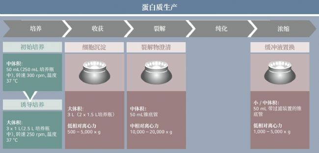 圖 1:基于 3L 培養(yǎng)體積的蛋白質(zhì)生產(chǎn)過程示例(包括所需的培養(yǎng)和離心步驟)