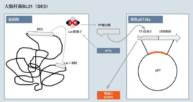 圖2:重組蛋白表達(dá)系統(tǒng):用質(zhì)粒pET28a轉(zhuǎn)化大腸桿菌BL21(DE3)菌株,該菌株含有受lacUV5啟動(dòng)子控制且表達(dá)T7 RNA聚合酶的基因。質(zhì)粒pET28a攜帶有受T7聚合酶控制的表達(dá)人磷酸絲氨酸磷酸酶(hPSP)的目的基因。IPTG(異丙基β-d-1-硫代半乳糖吡喃糖苷)誘導(dǎo)Lac啟動(dòng)子,導(dǎo)致T7聚合酶的表達(dá),并間接導(dǎo)致hPSP基因的表達(dá)。