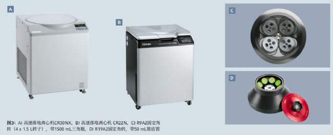 圖3:A) 高速落地離心機(jī)CR30NX,B) 高速落地離心機(jī) CR22N,C) R9A2固定角轉(zhuǎn)(4 x 1.5 L轉(zhuǎn)子),帶1500 mL三角瓶,D) R19A2固定角轉(zhuǎn),帶50 mL錐底管