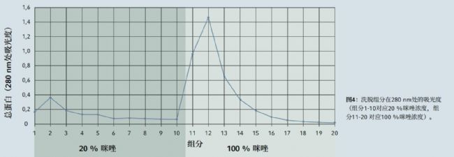 用 3 到 5 倍柱體積的蒸餾水洗滌 HisTrap® FFcrude 層析柱,再用至少 5 倍柱體積的結(jié)合緩沖液進(jìn)行平衡。持續(xù)攪拌400mL 澄清裂解液的同時(shí),將其以 10mL/min 的流速緩慢加入層析柱。用結(jié)合緩沖液清洗層析柱,直至吸光度達(dá)到穩(wěn)定的基線(約 15 個(gè)柱體積)。通過一步操作完成洗脫:前 10 個(gè)組分用 20% 咪唑的洗脫緩沖液收集,而后 10 個(gè)組分用 100 %咪唑的洗脫緩沖液以 5 mL/ 組分 / 分鐘的流速收集。