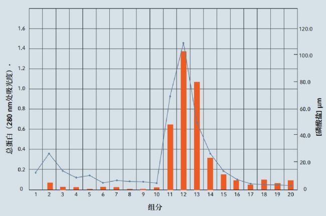 圖6:結(jié)合了每個(gè)洗脫組分的酶活性(橙色條)和280 nm處的吸光度(藍(lán)點(diǎn)/線)的測量圖。