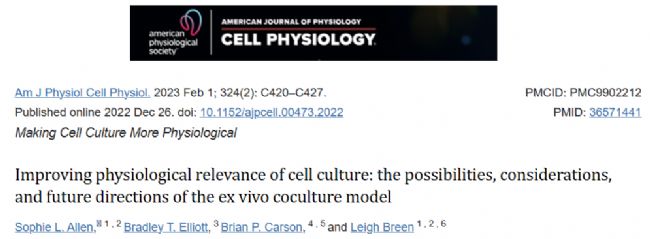 參考文獻(xiàn):Allen SL, Elliott BT, Carson BP, Breen L. Improving physiological relevance of cell culture: the possibilities, considerations, and future directions of the ex vivo coculture model. Am J Physiol Cell Physiol. 2023 Feb 1;324(2):C420-C427. doi: 10.1152/ajpcell.00473.2022. Epub 2022 Dec 26. PMID: 36571441; PMCID: PMC9902212.