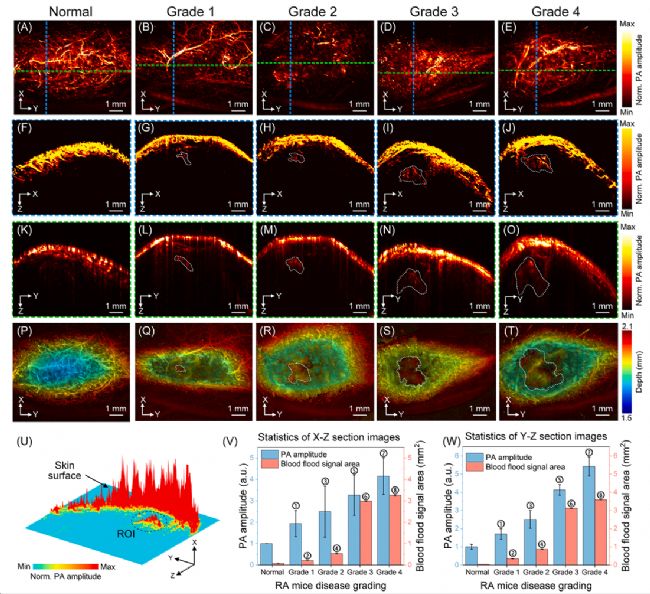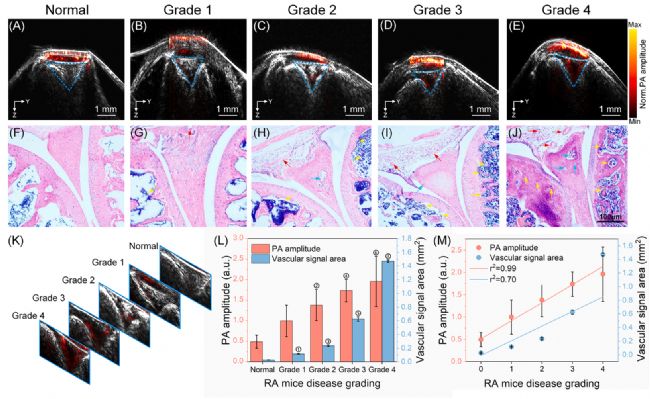 汕頭大學第一附屬醫(yī)院胡軍教授與他的團隊使用了光聲/超聲雙模態(tài)成像的方式對RA的關節(jié)炎中血管翳生成以及滑膜侵蝕方面進行了探索,實驗通過使用不同患病程度的小鼠模型,使用ANI的光聲成像對小鼠后爪皮下血管進行監(jiān)測。通過光聲成像結(jié)果(圖1)來看,可以明顯看出成像血管翳增生的面積和光聲信號強度均與RA疾病分級呈正相關性。