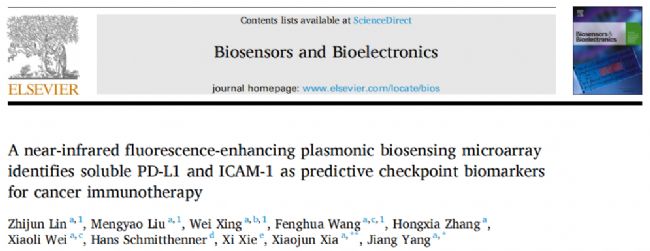 近期,來(lái)自華南腫瘤國(guó)家重點(diǎn)實(shí)驗(yàn)室,廣東省鼻咽癌診療重點(diǎn)實(shí)驗(yàn)室以及中山大學(xué)腫瘤防治中心的楊江教授報(bào)道了一種基于生物傳感器,用于高敏檢測(cè)可溶性免疫檢查點(diǎn)預(yù)測(cè)分子sICAM-1(細(xì)胞間黏附分子-1)和sPD-L1(細(xì)胞程序性死亡-配體1)的文章,題目為“A near-infrared fluorescence-enhancing plasmonic biosensing microarray identifies soluble PD-L1 and ICAM-1 as predictive checkpoint biomarkers for cancer immunotherapy”于2023年8月發(fā)表在國(guó)際生物傳感器權(quán)威雜志Biosensors and Bioelectronics上。