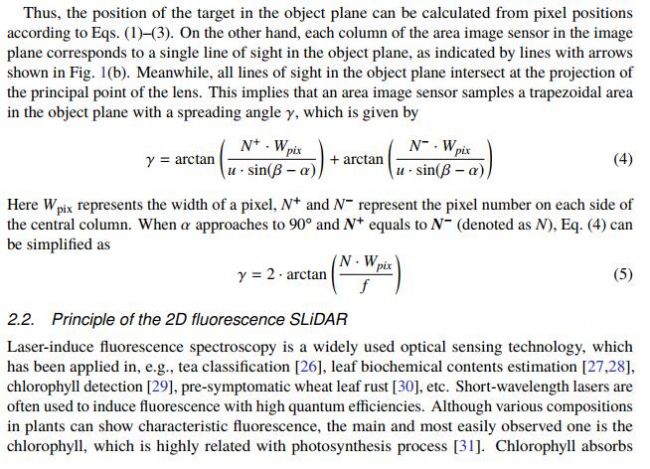 Vol. 28, No. 7 / 30 March 2020 / Optics Express 9270 etc. [13]. Full waveform multispectral LiDAR is able to provide multispectral 3D data clouds by using a supercontinuum laser [14,15]. Yotam et al., proposed an automatic algorithm employing a series of global optimizations to consolidate a point cloud into skeletal structures. However, the existence of dense crowns could be a great challenge for the 3D reconstruction [16]. Three-dimension coordinate points-based methods are promising for wood-leaf separation, but requiring a high-quality point cloud [17]. Fluorescence LiDAR techniques, mainly based on the Newtonian telescope structure, have been used in atmospheric aerosol measurements.When using fluorescence LiDAR for plant detection in short distance, data acquisition card with sampling rate higher than 1 GHz has to be used for resolving the fine profile [18]. If the position information as well as the laser-induced fluorescence (LIF) signal, or even multi-channel fluorescence signals can be measured by the LiDAR technique, more accurate and direct methods can be developed for leaves/branches separation and tree reconstruction.