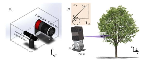 3.1. Apparatus The schematic of the fluorescence SLiDAR is shown in Fig. 3(a). The fluorescence SLiDAR consists of a commercial blue laser diode with a central wavelength of 405 nm and a maximum output power of 1 W. A cylindrical lens is mounted to generate a light sheet with a spreading angle of 50° on the s-t plane. The sector angle can be adjusted by replacing the cylindrical lens with different focal lengths. The backscattering light from the illuminated surface is collected by an imaging lens (Canon, Japan) with a focal length of 18 mm and an aperture of 58 mm. The distance from the central of the lens to the light-sheet plane is set to 100 mm. The angle between the CMOS camera and the lens is 10.2°, calculated according to Eq. (1). The CMOS camera (Panasonic, Japan, 4656×3520 pixels, 3.8 µm) is capable of measuring the incoming light with RGB channels. The light intensity of the laser diode is modulated with a square wave to enable measurements under illumination. In one measurement period, the CMOS shoots two photos with laser diode on and off, respectively. The background light, recorded with the laser diode off, can then be subtracted dynamically.