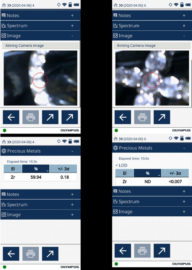 兩種鉆石雖然看起來相似,但是它們的化學(xué)成分大不相同。Vanta分析儀在第一件首飾中沒有發(fā)現(xiàn)鋯元素。與此相反,對第二件首飾進(jìn)行的化學(xué)分析發(fā)現(xiàn)鋯(Zr)的成分占據(jù)了主導(dǎo)地位。