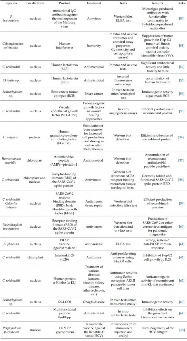 近十年來微藻在重組蛋白生產(chǎn)領(lǐng)域的成就(圖表節(jié)選自Gerszberg, A.; Kolek, L.; Hnatuszko-Konka, K. In Vitro Culture, Genetic Transformation and the Production of Biopharmaceuticals in Microalgae. Int. J. Mol. Sci. 2025, 26, 3890.)